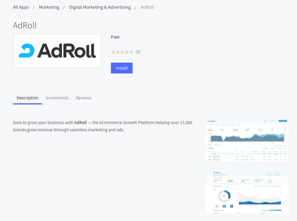 Go here or find the AdRoll app in the BigCommerce marketplace.Install and allow the AdRoll app to access your store.
