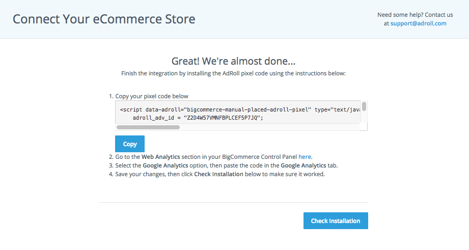 - Places the AdRoll pixel on all pages of your BigCommerce store.