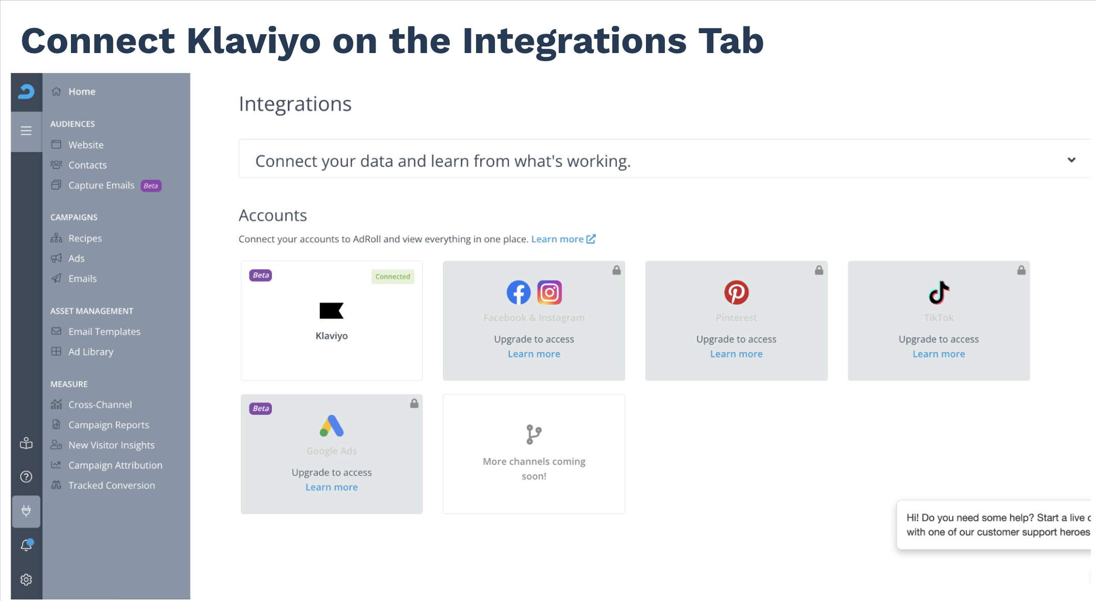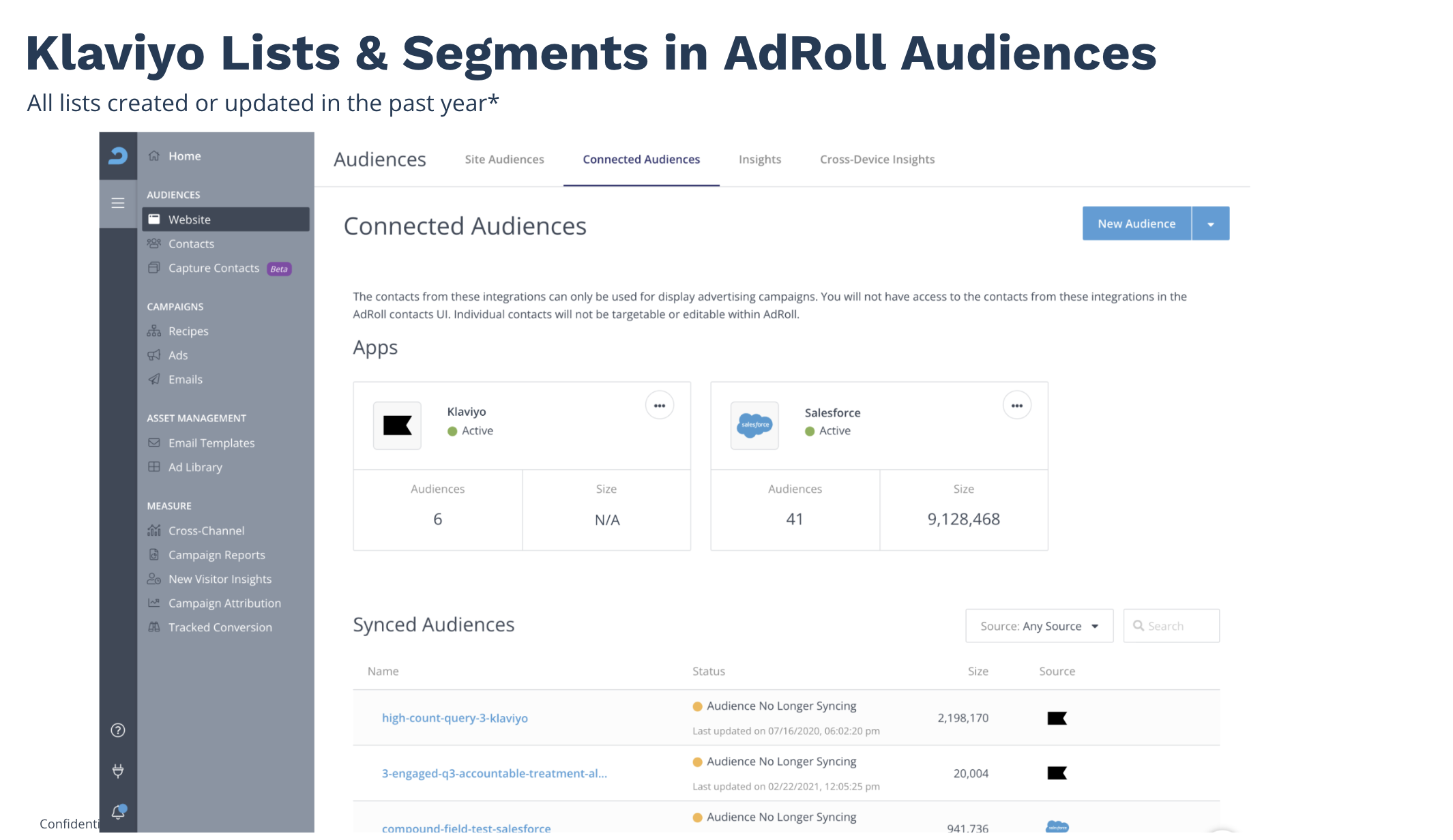 By connecting your Klaviyo account directly to AdRoll, you ensure your target audiences are automatically synced, saving you valuable time and effort.