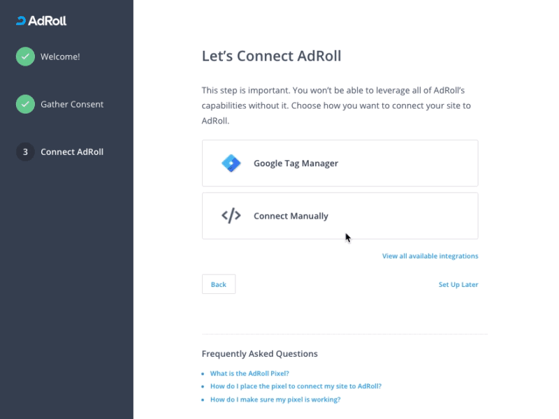 Unfortunately, it is not possible to connect your e-commerce store to AdRoll from the dashboard if you skip the step during account creation. In that case, you can reach out to our customer support team and they will help you connect to the store.